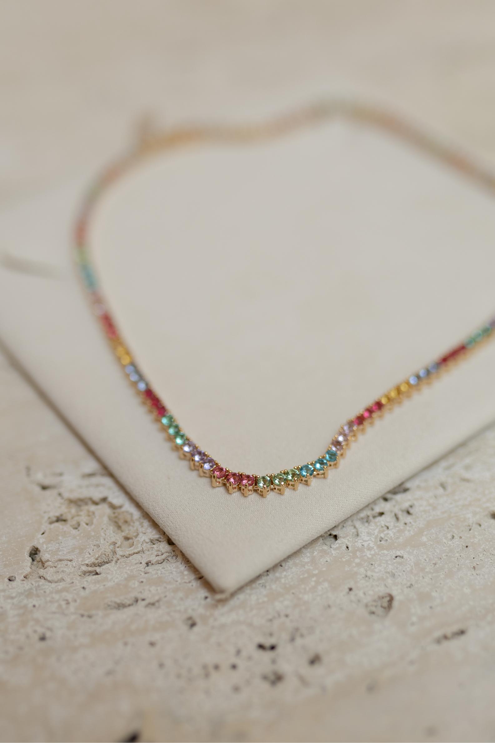 Colar choker no estilo riviera com zircônias rainbow (rubi, cristal, citrino e ametista) com fecho de joia no banho de ouro 18k.