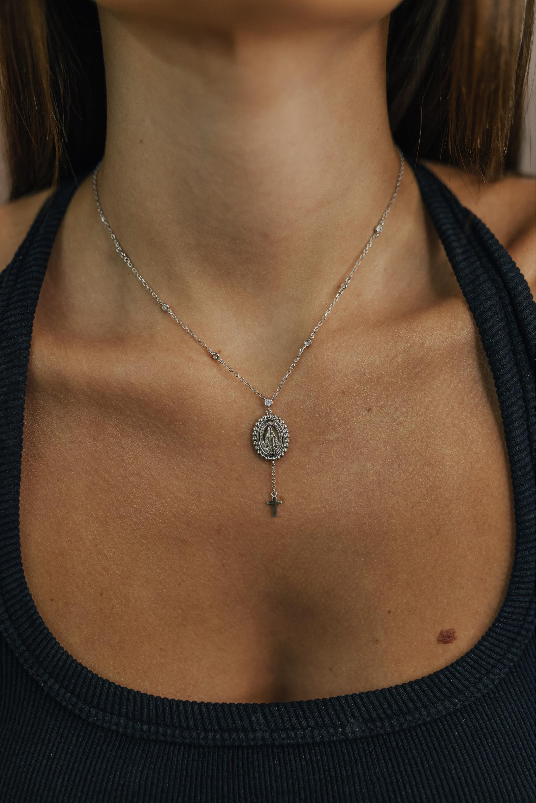 Colar Terço Com Nossa Senhora das Graças Confete Prata 925 Ródio Branco