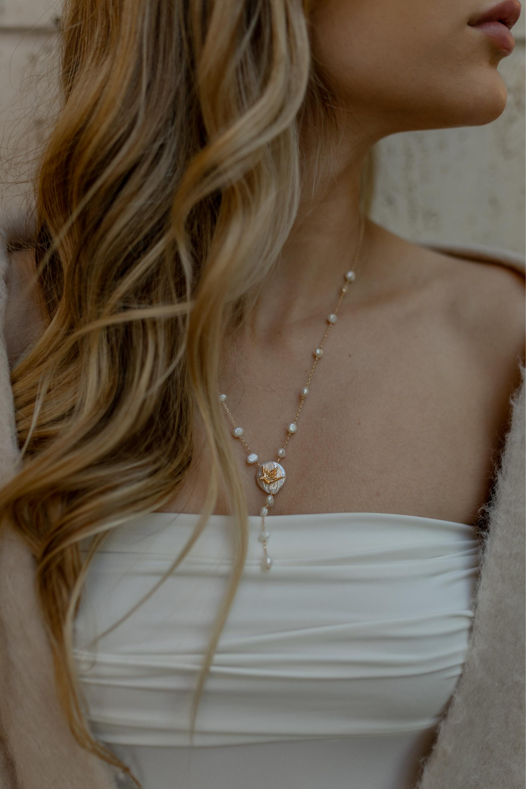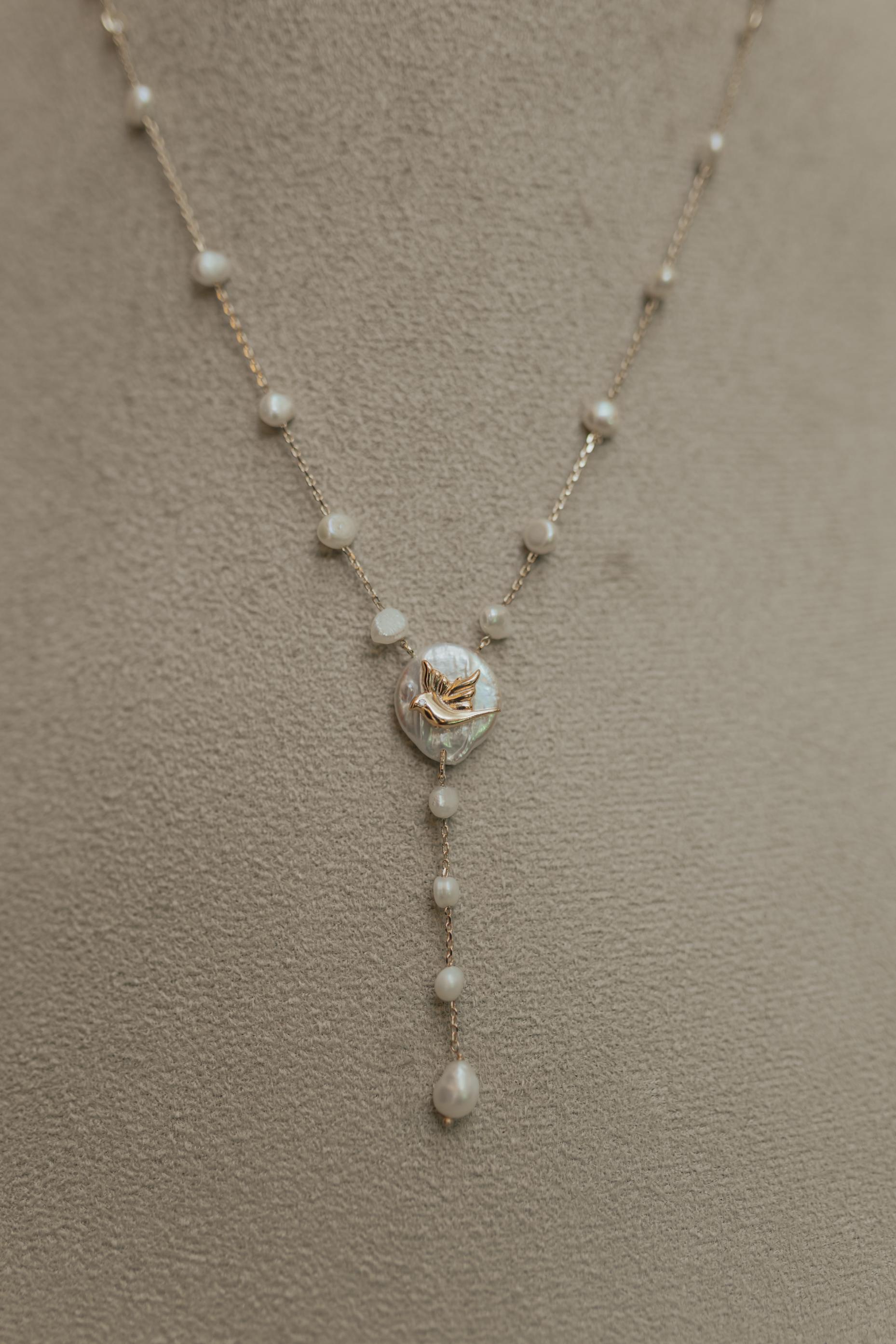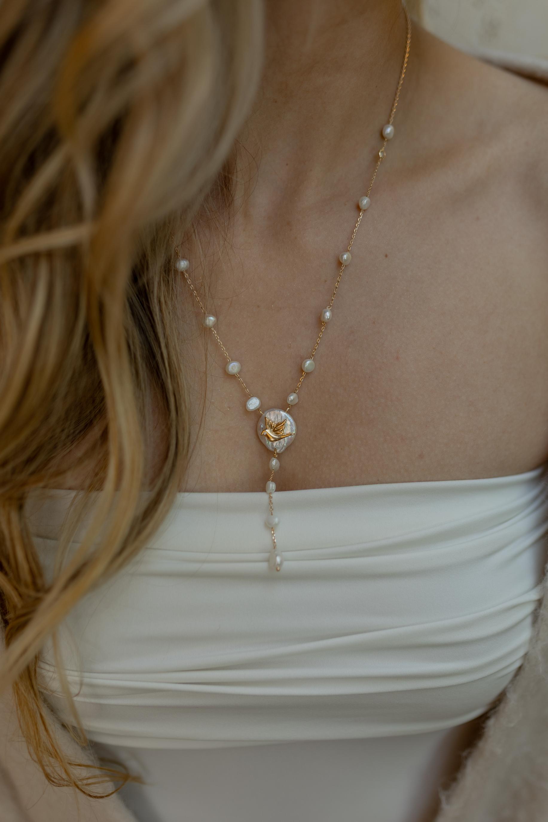 Colar terço com pérolas de água doce com pingente de Espírito Santo no banho de Dourado 18k.