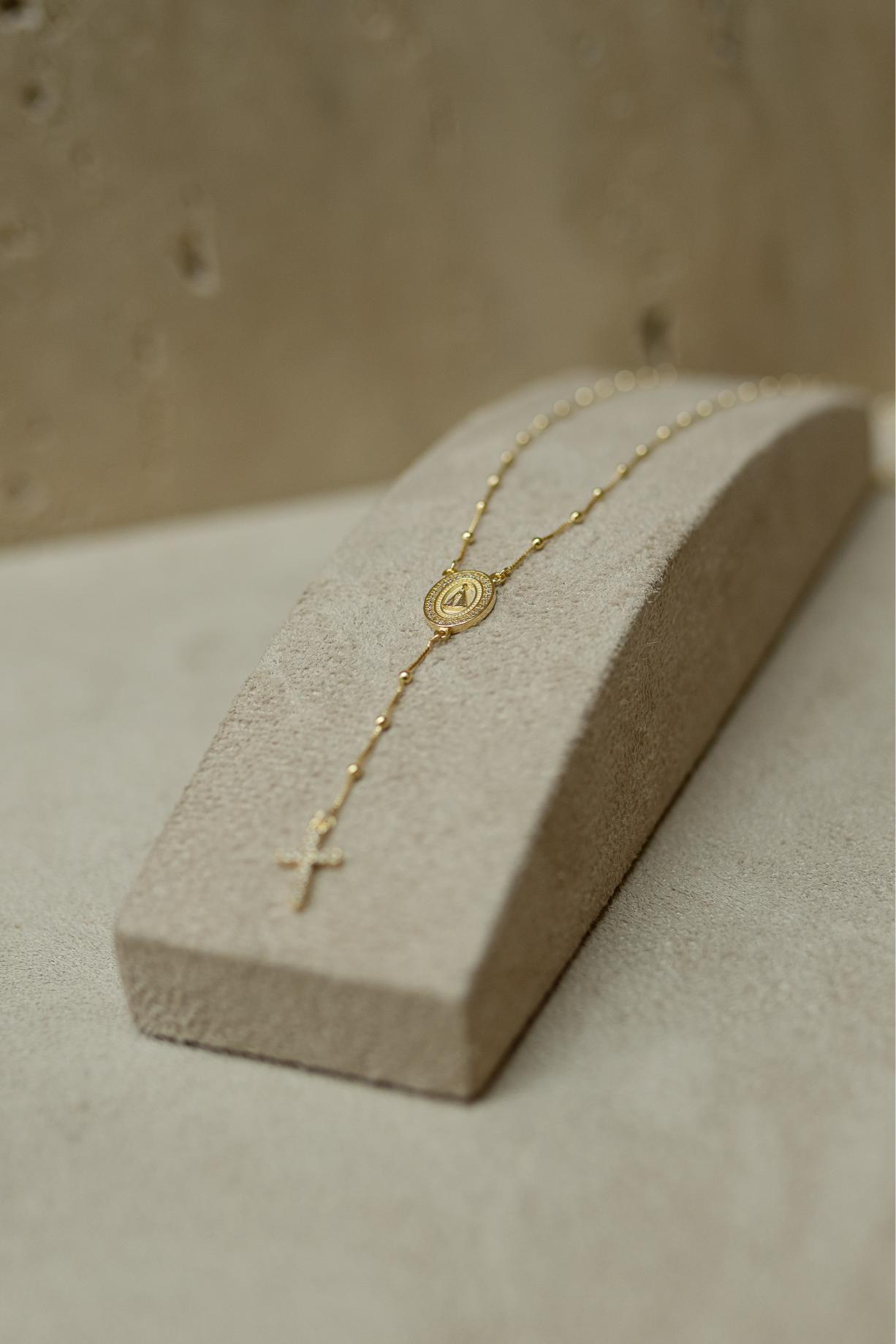 Colar com design de Terço no banho de ouro 18k e medalha de Nossa Senhora Aparecida, com detalhes em bolinhas e cravejado com zircônias na cor cristal.