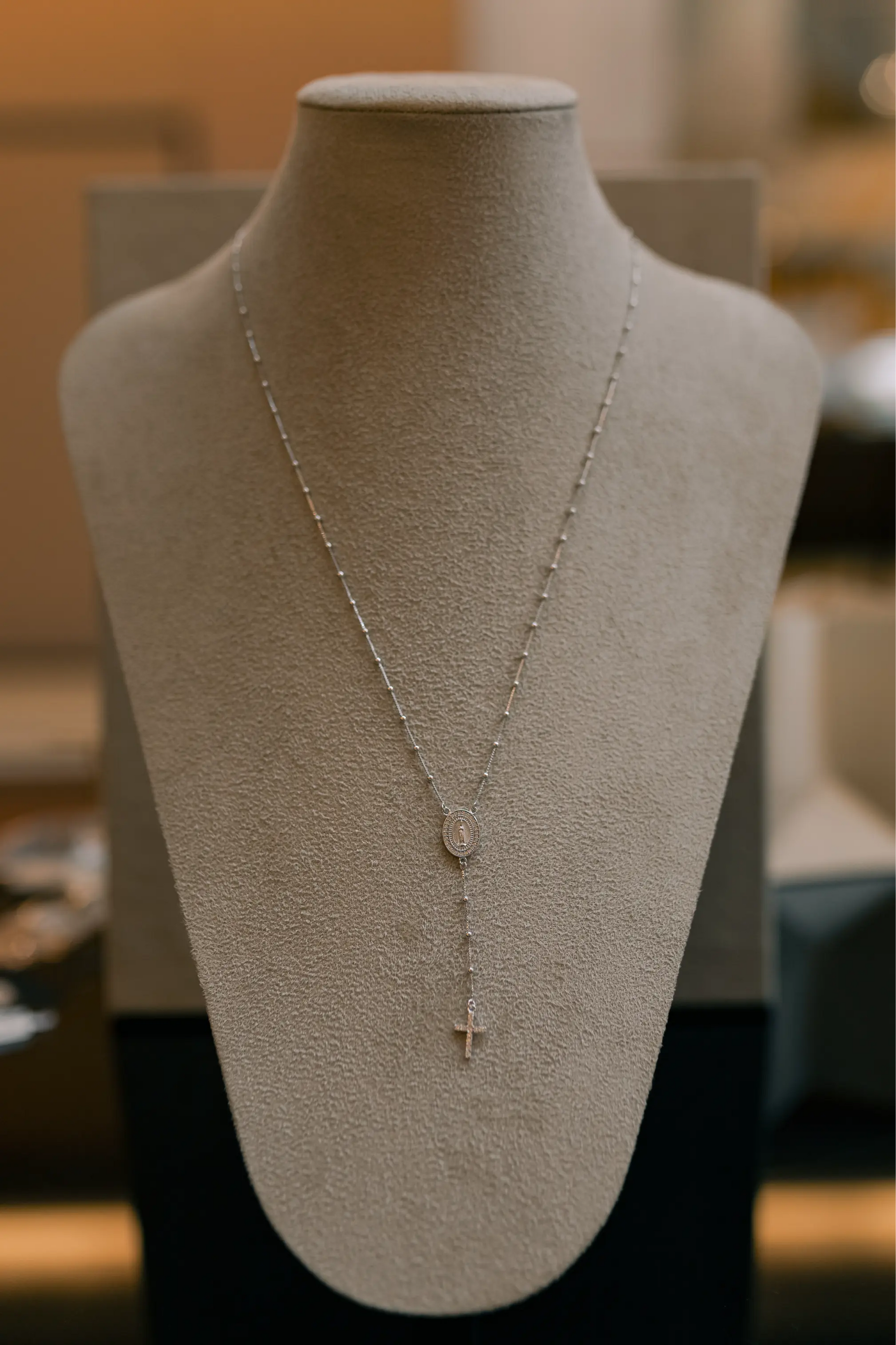 Colar com design de Terço no banho de ródio branco e medalha de Nossa Senhora de Fátima, com detalhes em bolinhas e cravejado com zircônias na cor cristal.