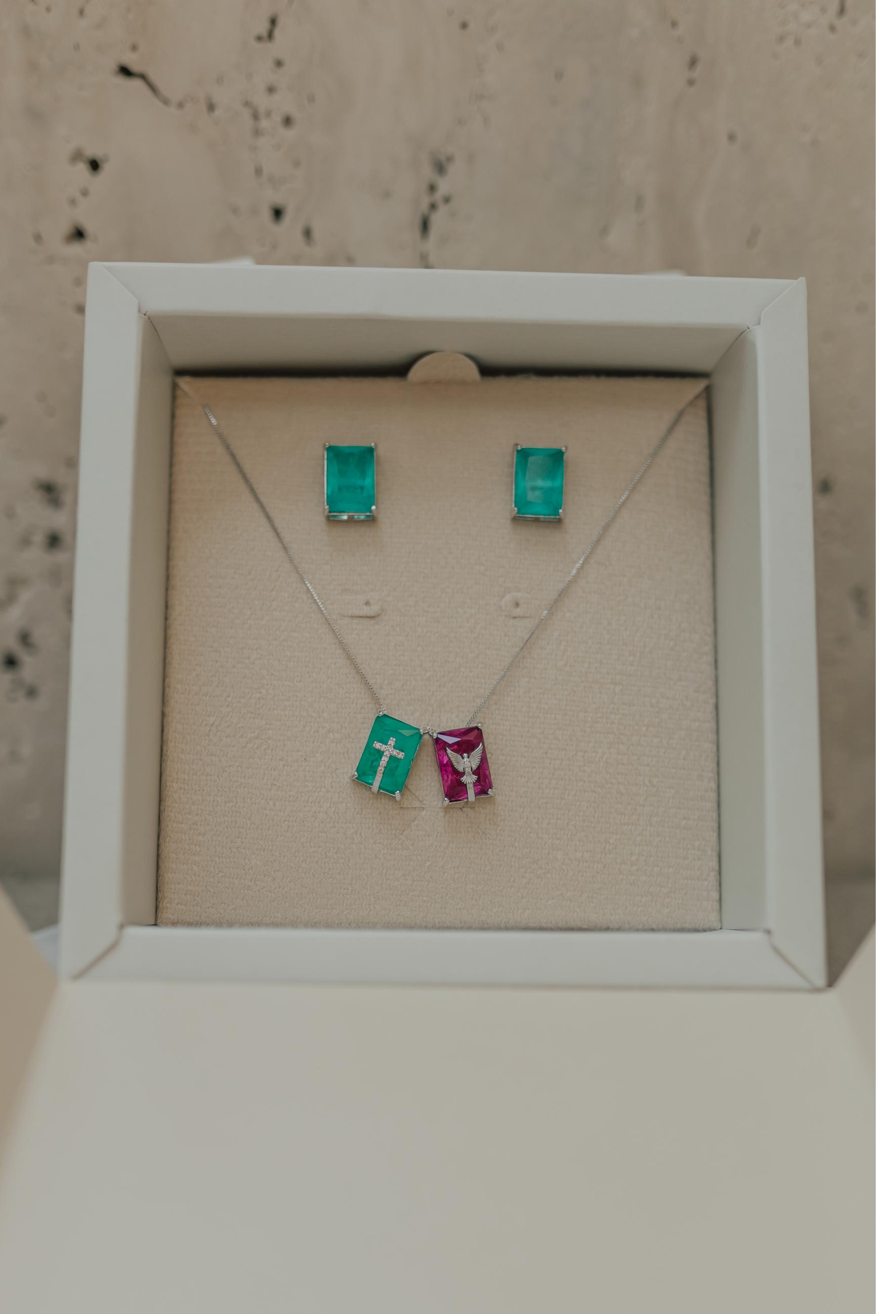 O destaque desta peça é a pedra Turmalina Paraíba Fusion, conhecida por sua cor verde e rosa vibrante e pela capacidade de refletir luz de forma única. A Turmalina Paraíba Fusion, uma gema criada em laboratório que imita a raríssima e valiosa Turmalina Paraíba natural, trazendo um toque de sofisticação e exclusividade ao escapulário.