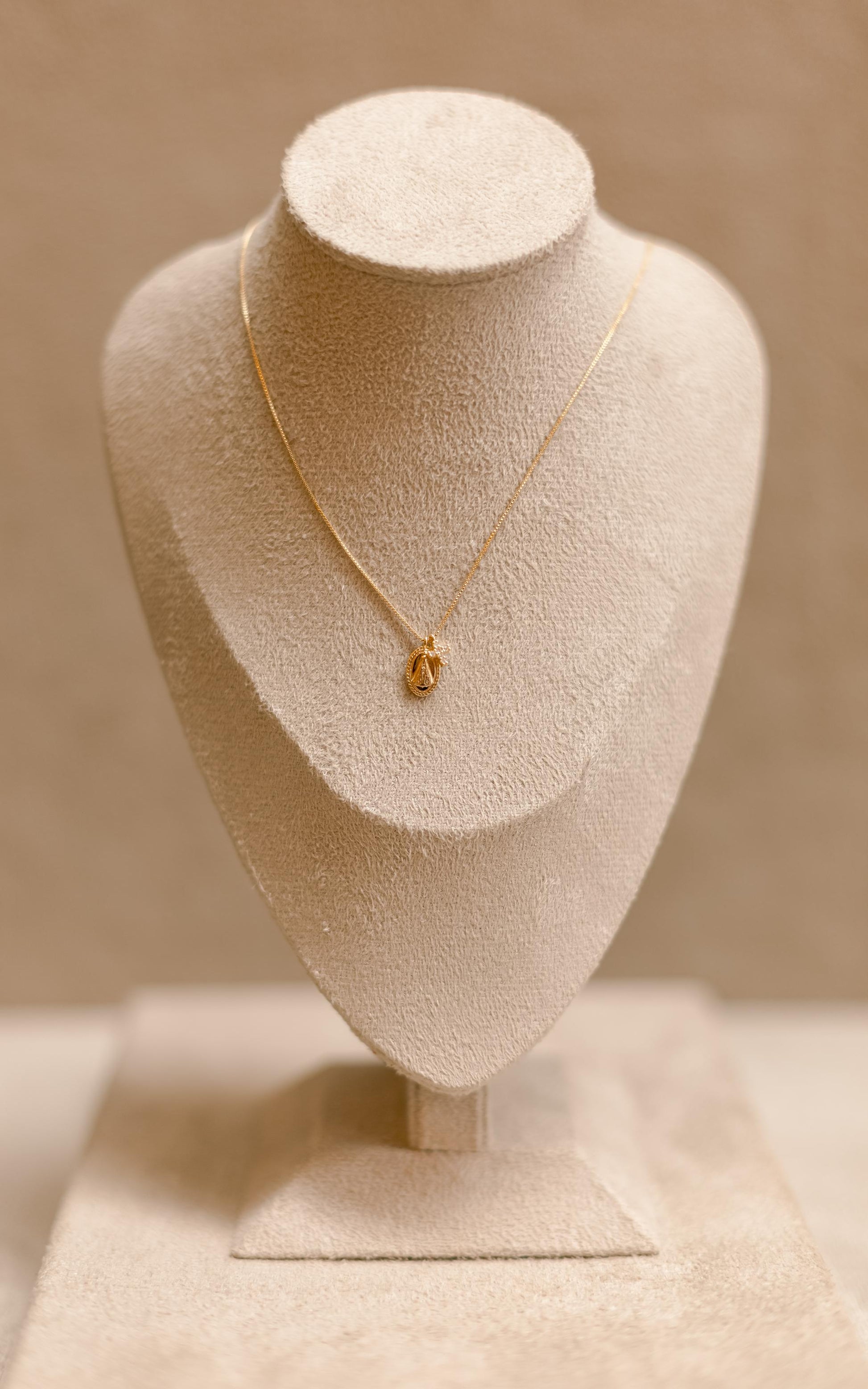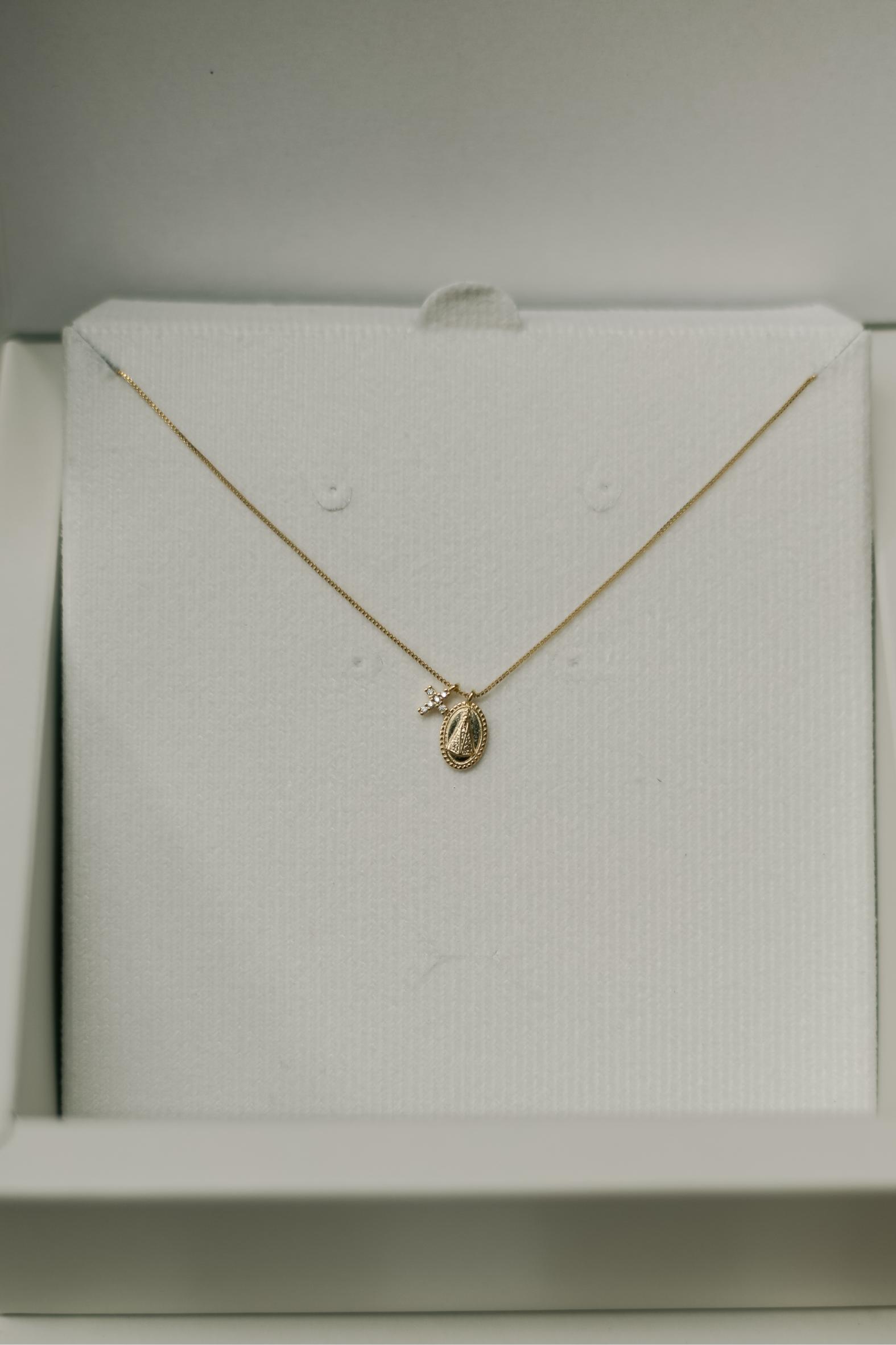 Colar super delicado com pingente de medalha de Nossa Senhora Aparecida e crucifixo cravejado com zircônias no banho de ouro 18k.