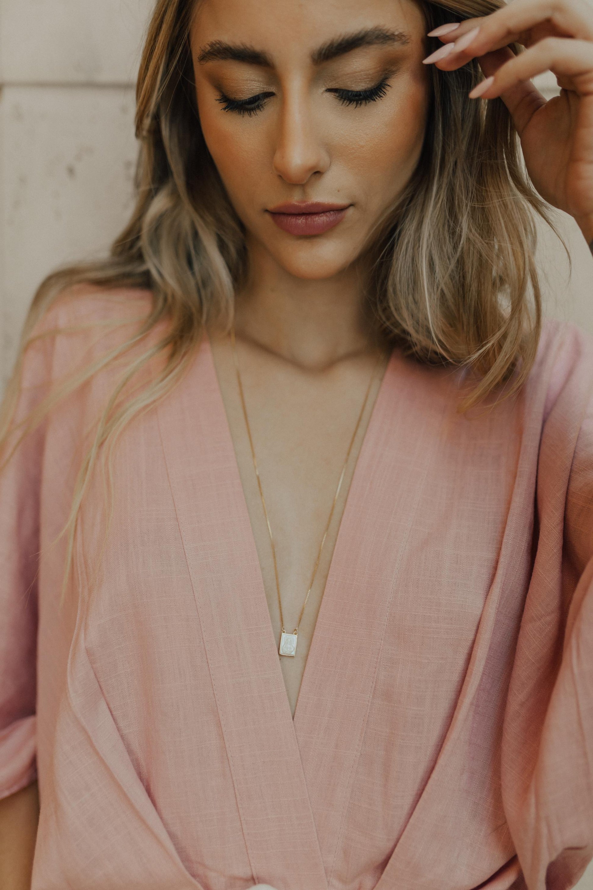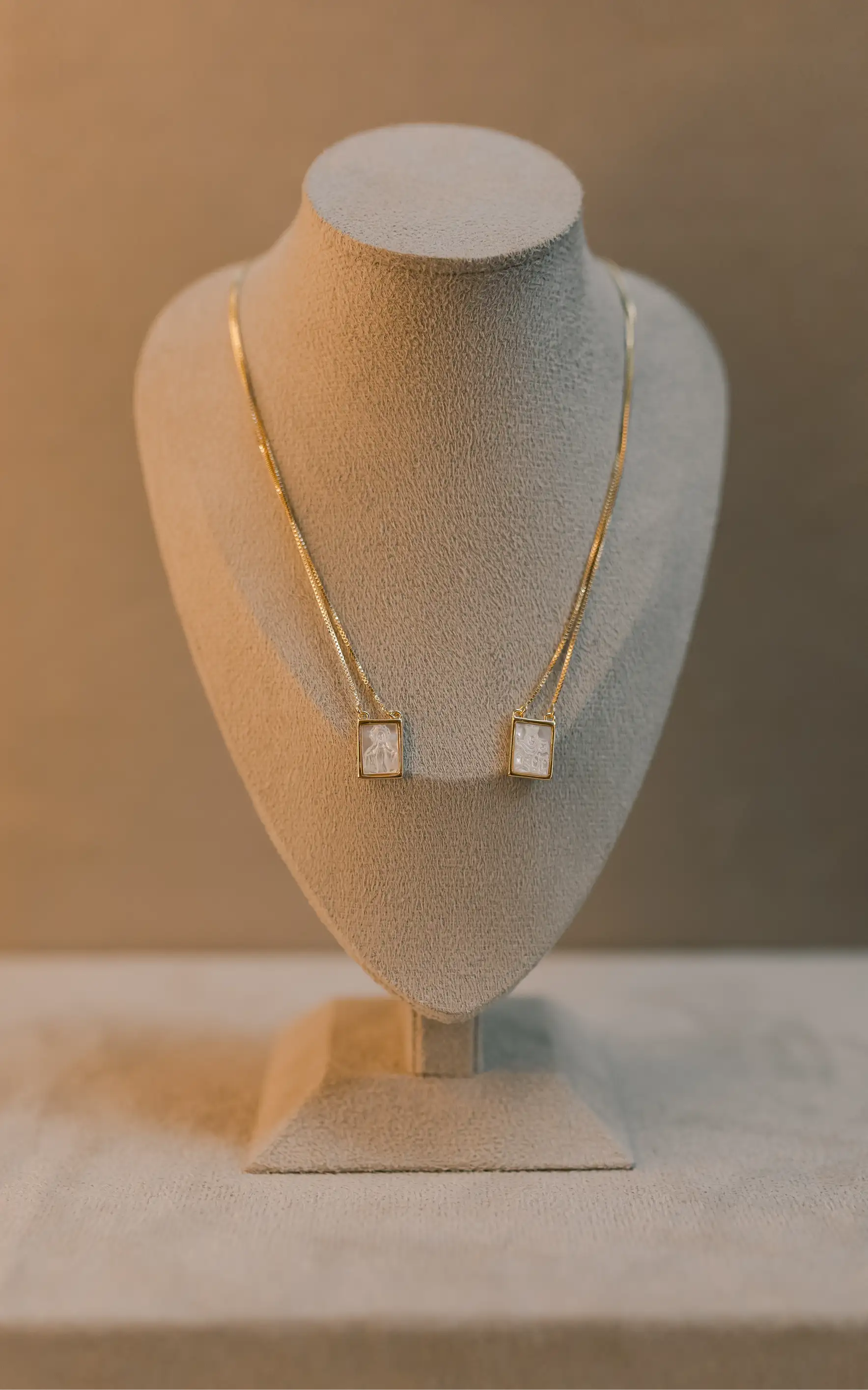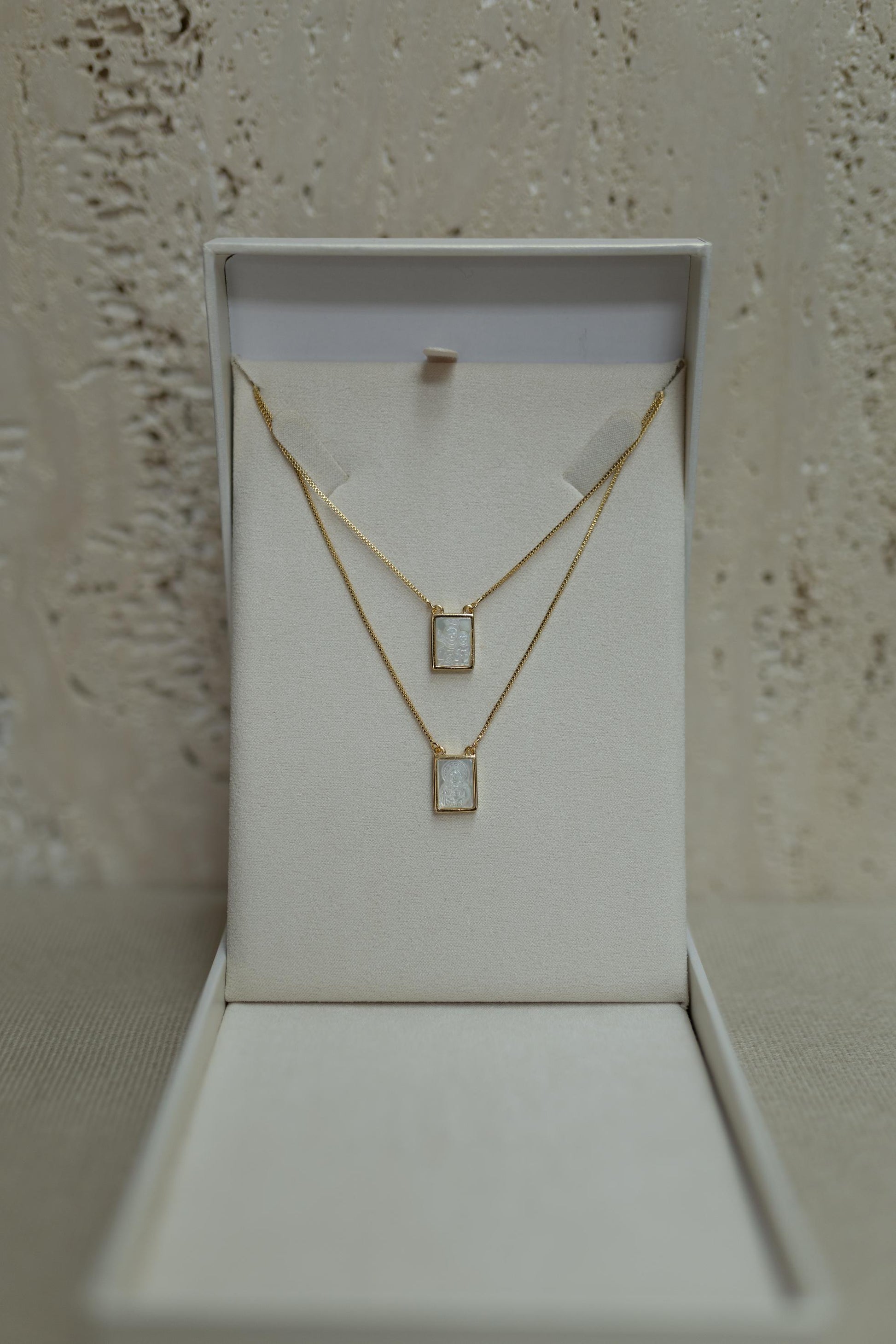 Colar escapulário em formato retangular com madre pérola no banho de ouro 18k.