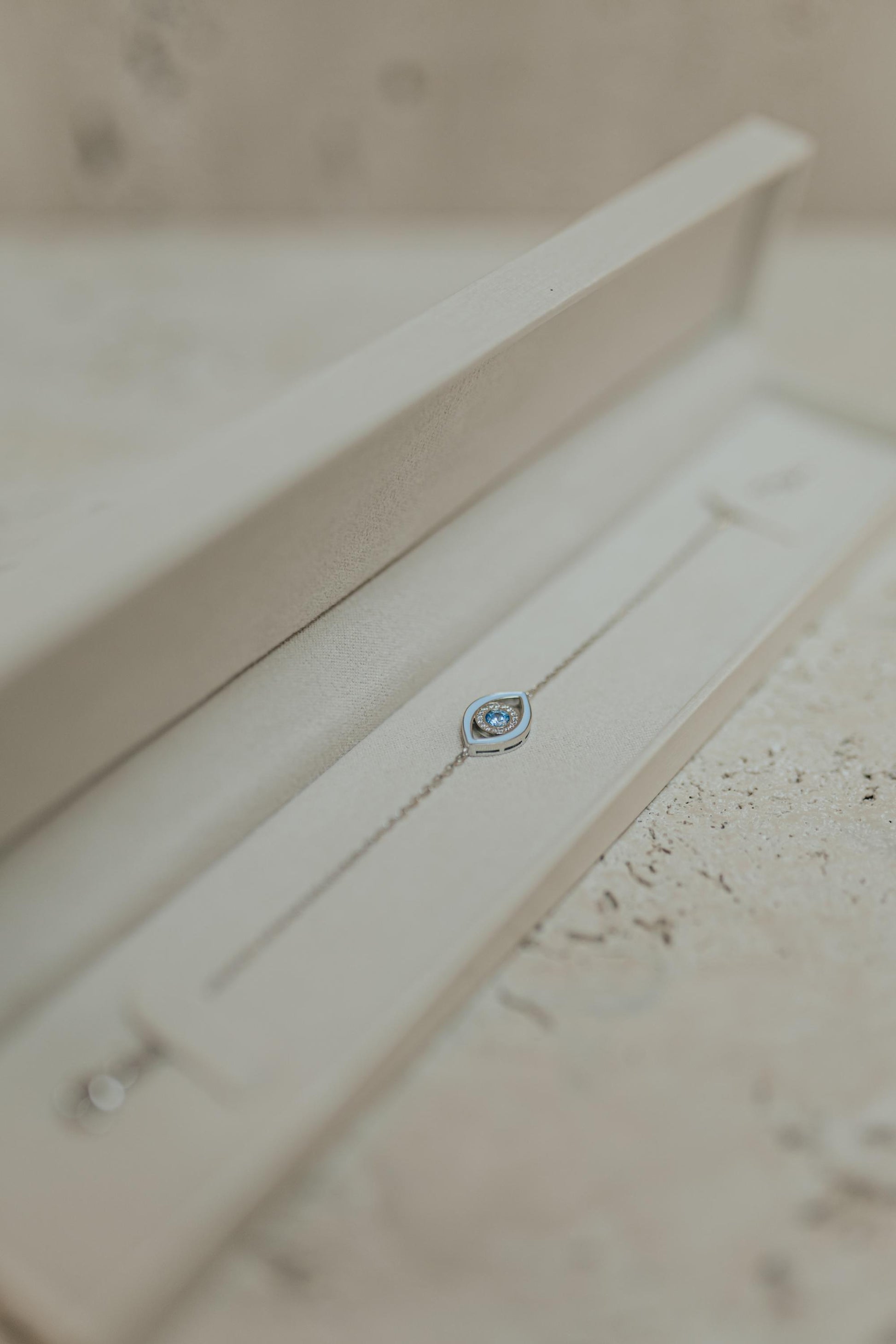 Pulseira com pingente de Olho Grego com zircônia na cor Acqua Marinha na prata 925 e banho de ródio branco.