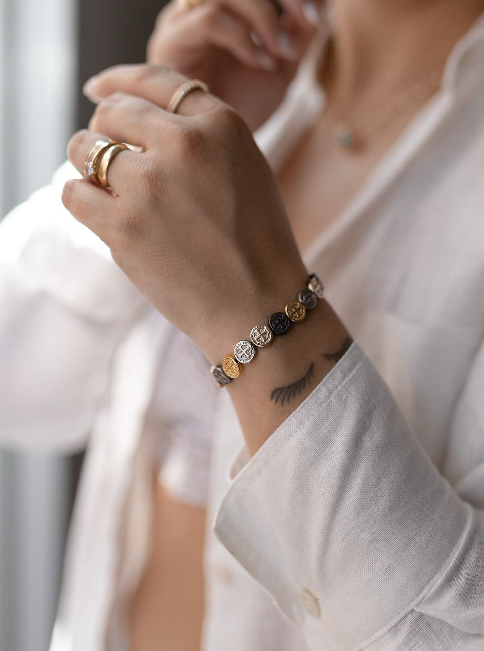 Pulseira de são bento com os 4 banhos (ródio branco, ouro, rose gold e ródio negro), interligadas por um fio resistente de silicone para facilitar a hora que você for usar, misture com outras pulseiras e arrase no look.