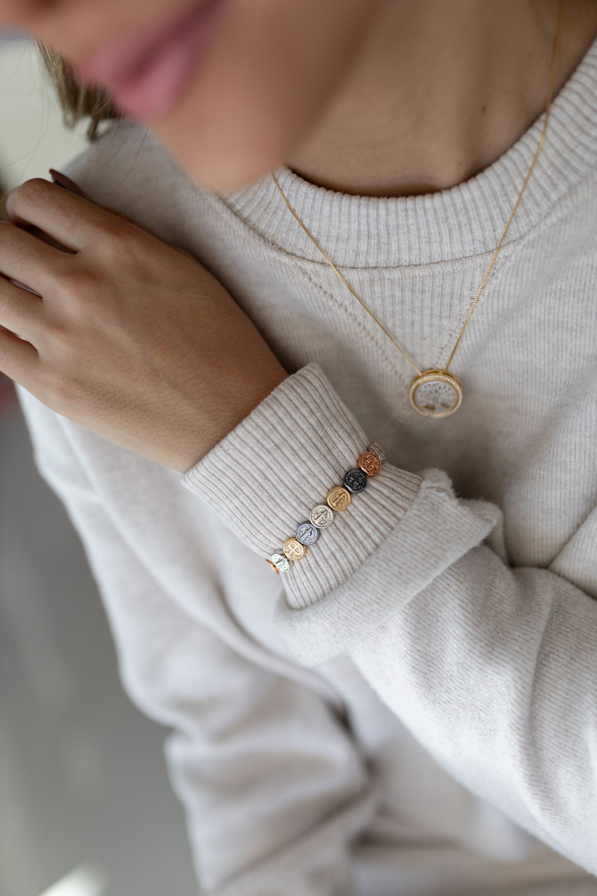 Pulseira de são bento com os 4 banhos (ródio branco, ouro, rose gold e ródio negro), interligadas por um fio resistente de silicone para facilitar a hora que você for usar, misture com outras pulseiras e arrase no look.