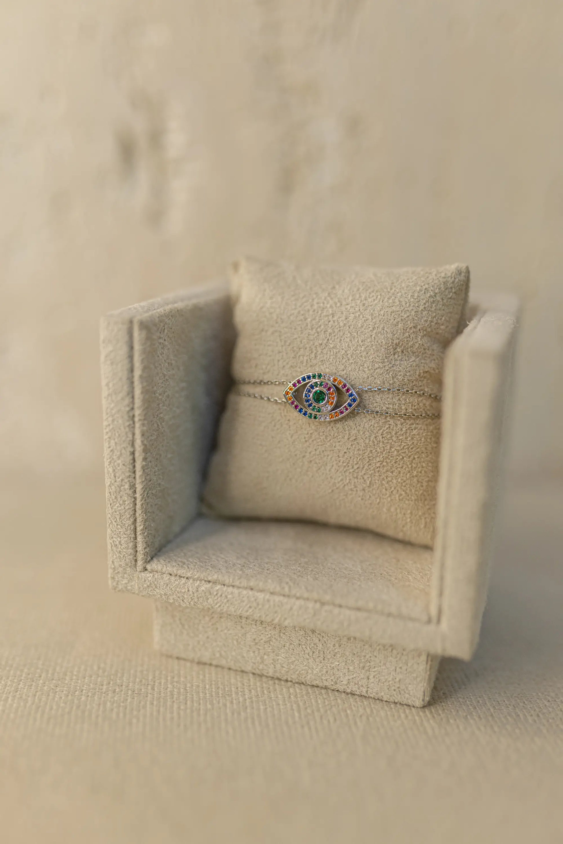 Pulseira de pingente de olho grego com zircônias coloridas no banho de ródio branco.