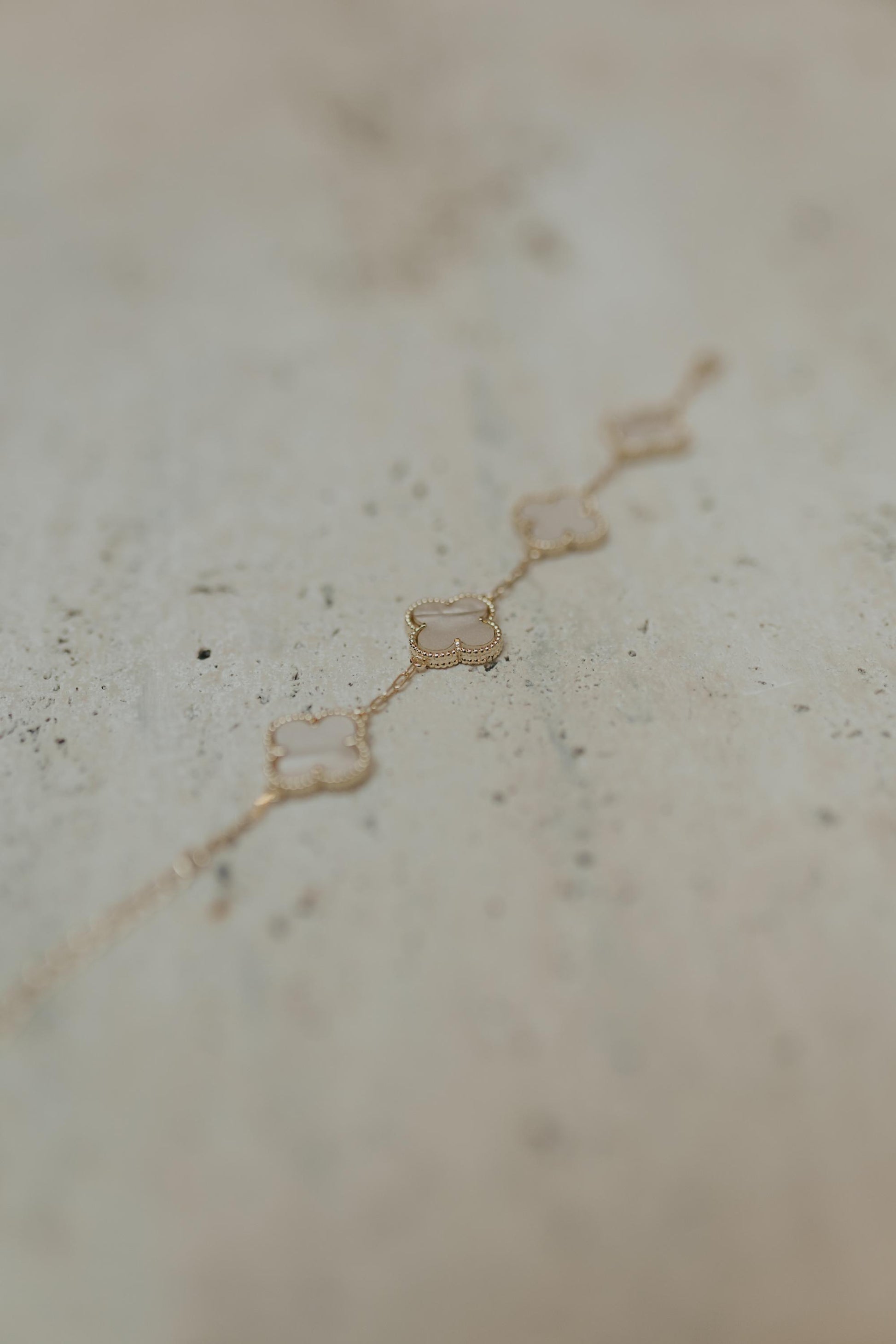 Pulseira com pingente de trevo marfim de resina no banho de ouro 18k.