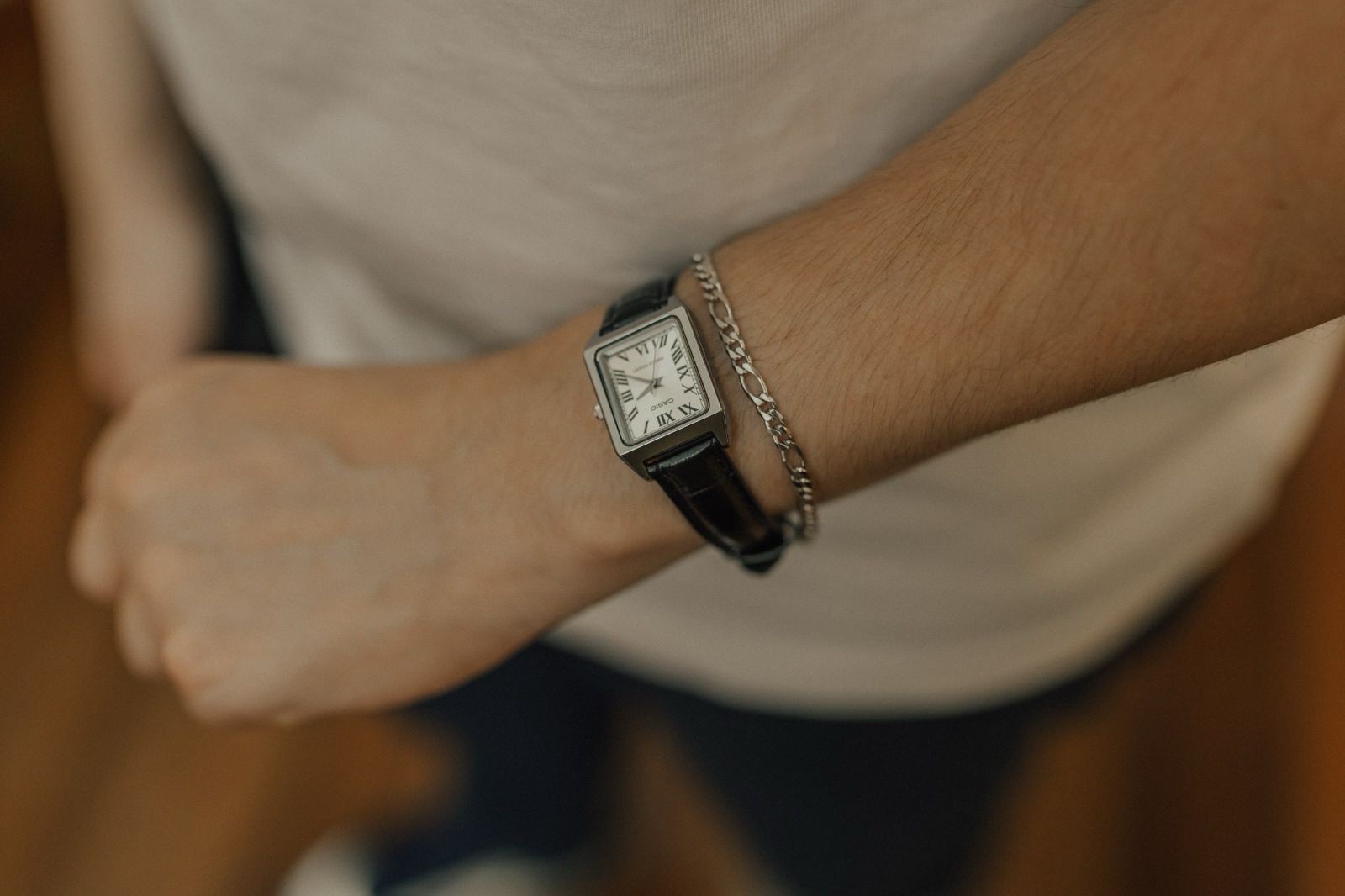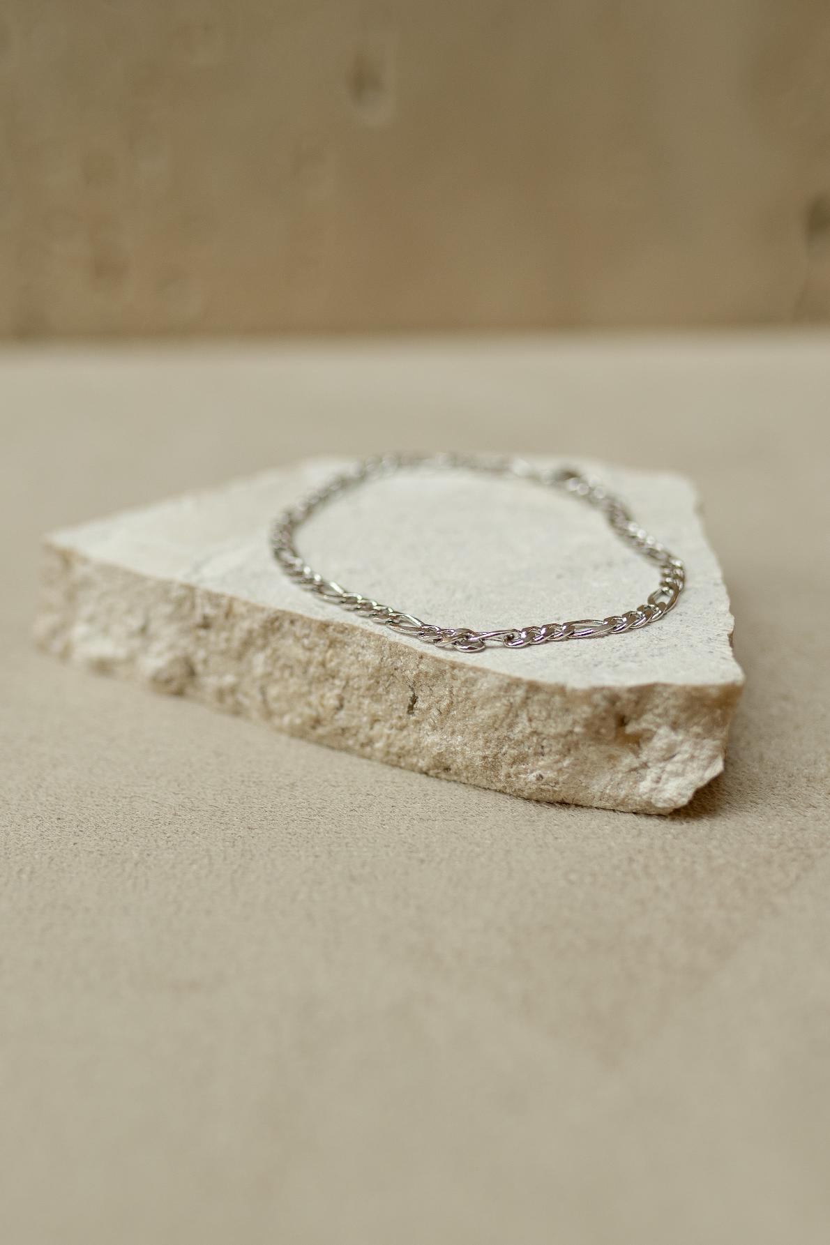 Pulseira masculina com elos Fígaro, acabamento liso e banho de ródio branco.