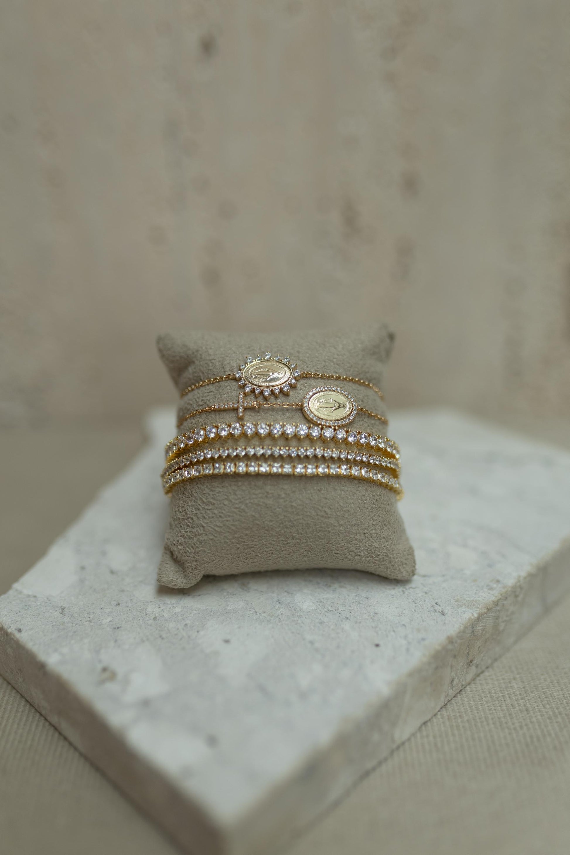 Pulseira com medalha de Nossa Senhora das Graças com borda cravejada e com medalha milagrosa no verso, com detalhe na corrente de um crucifixo cravejado de moissanites em prata 925, no banho de ouro 18k.