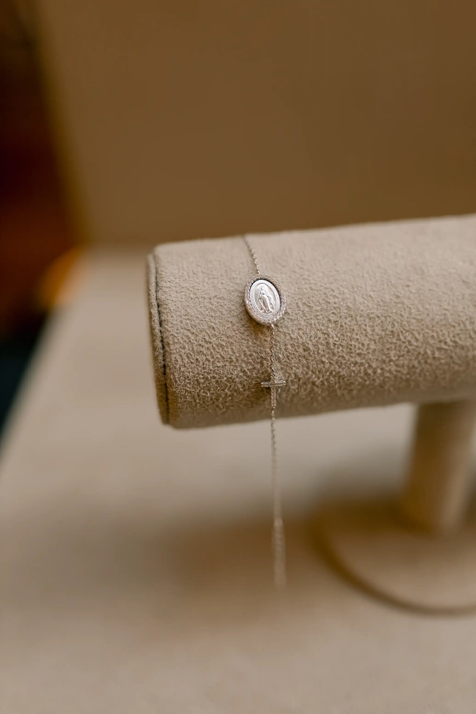 Pulseira com medalha de Nossa Senhora das Graças com borda cravejada de moissanite e com medalha milagrosa no verso, com detalhe na corrente de um crucifixo cravejado de moissanites em prata 925, no banho de ródio branco.