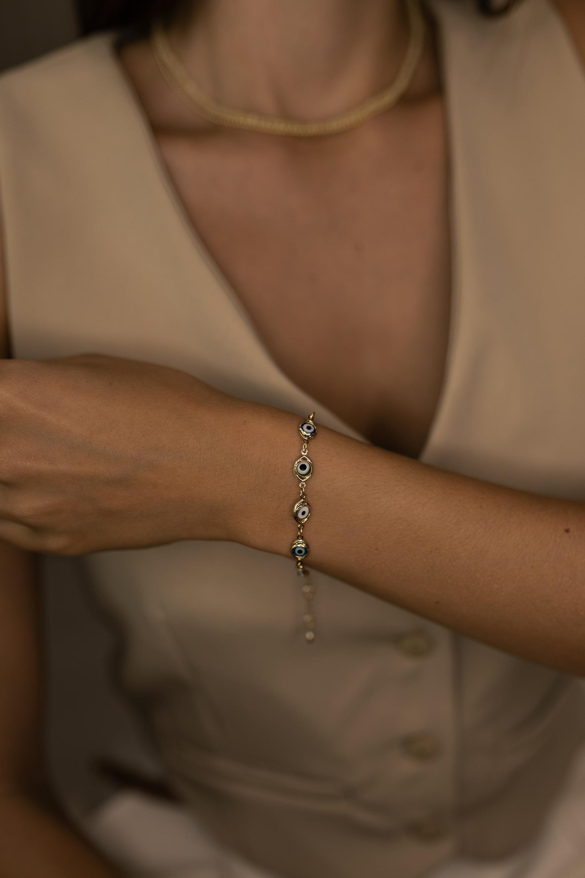 Pulseira com apliques de olho grego em várias cores e banho de ouro 18k.