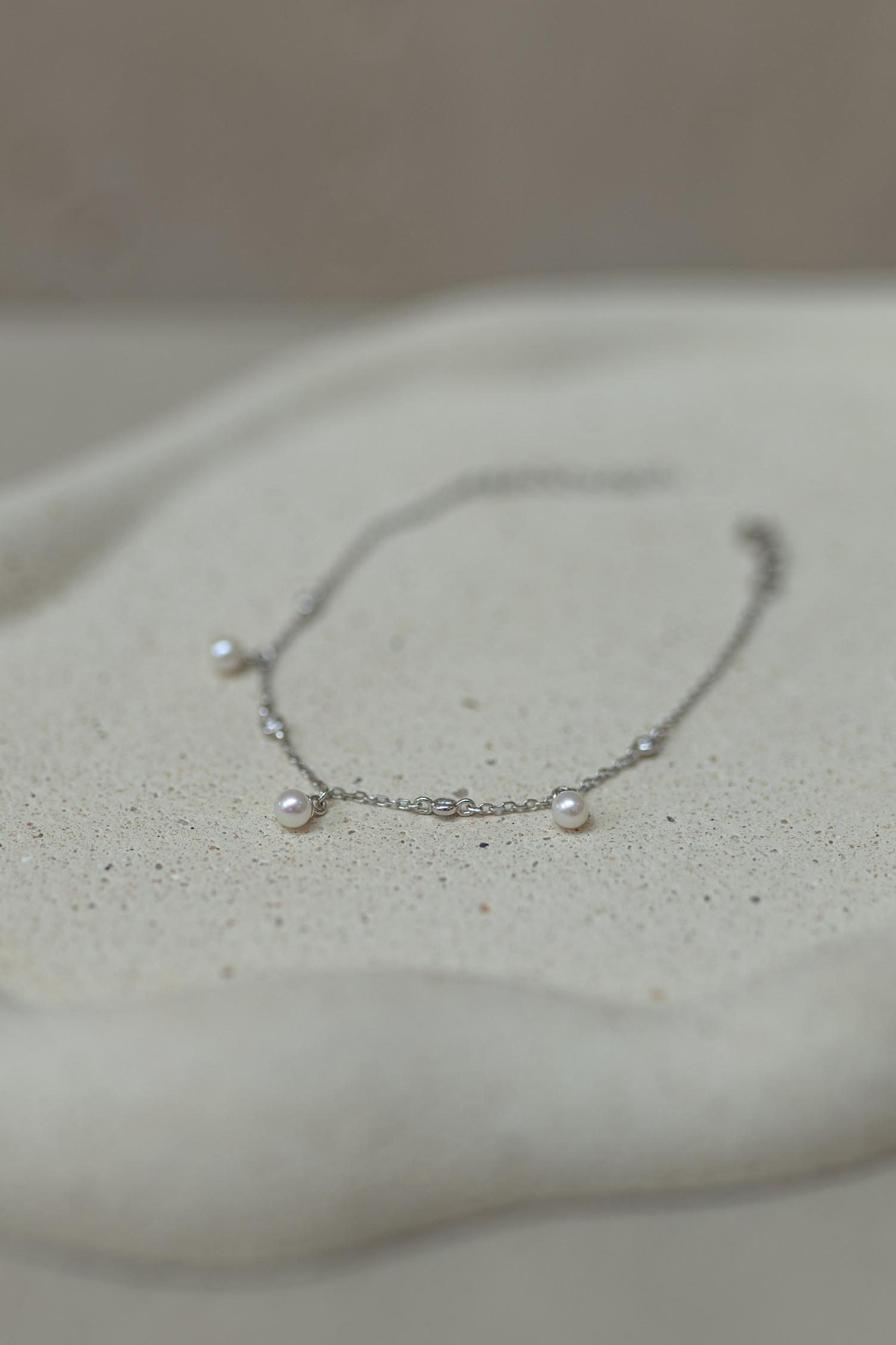 Pulseira Prata 925 com pérolas naturais e ponto de luz Moissanite 2mm, banhada a ródio branco.