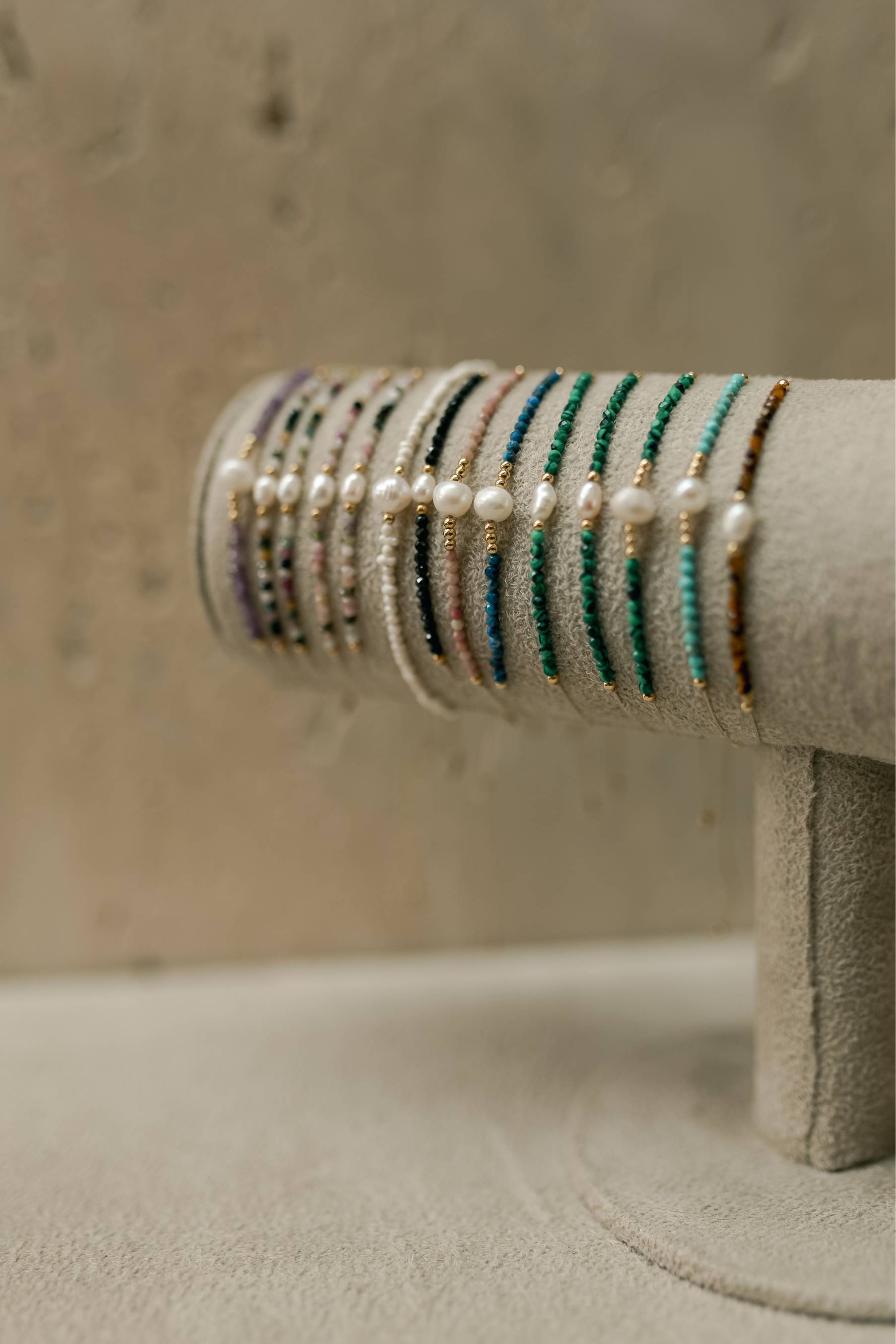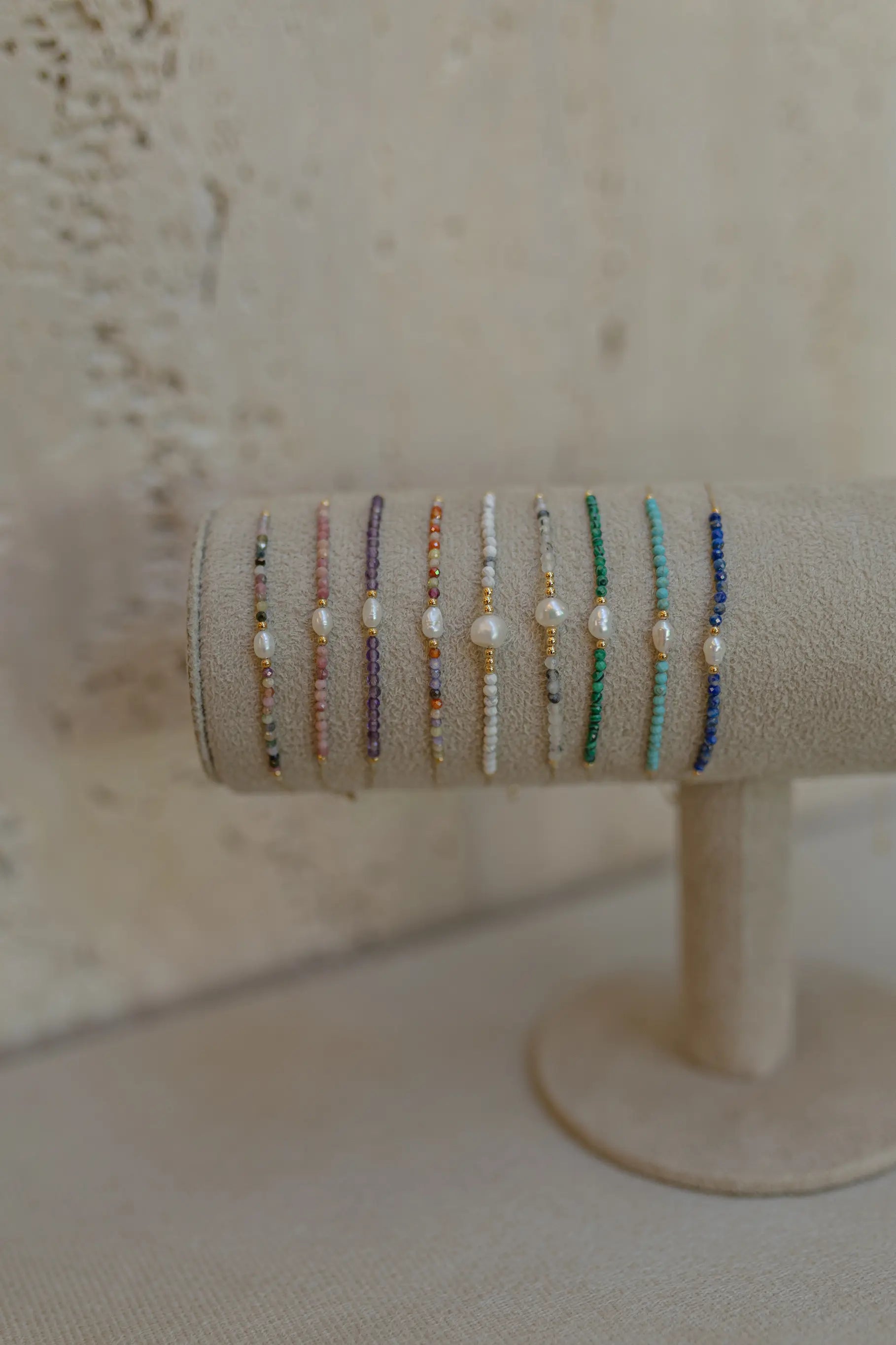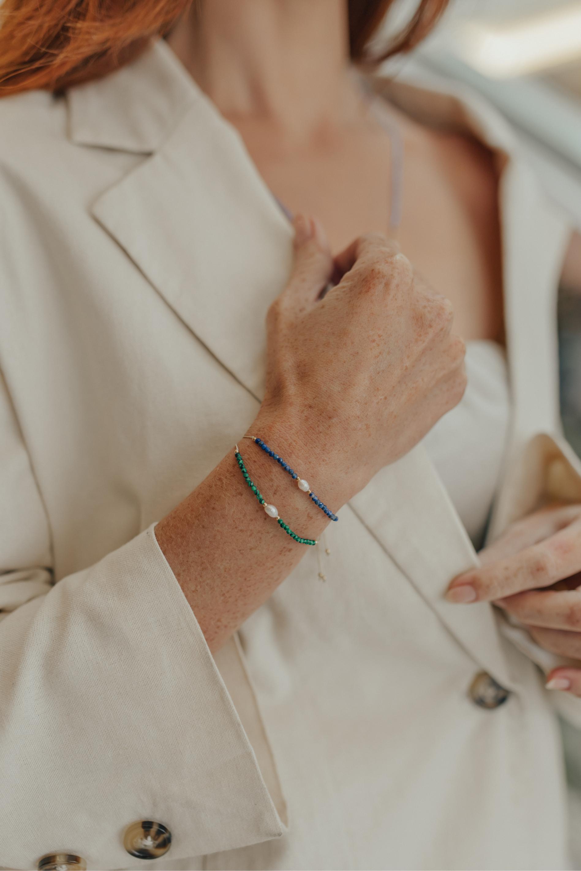 Pulseira Ajustável com fio de seda e pedras naturais com detalhe de pérola natural.