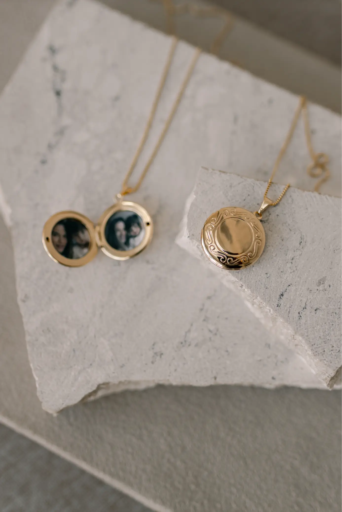 Colar relicário possui um pingente redondo com a borda trabalhada, com espaço para colocar 2 fotos no banho de ouro 18k.